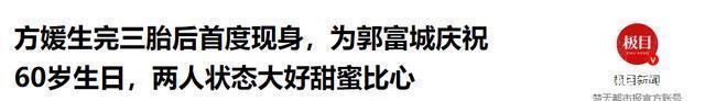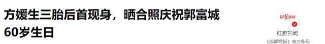 部分参考资料: 方媛生完三胎后首度现身,为郭富城庆祝60岁生日,两人状态大好甜蜜比心——极目新闻 方媛回应三胎再得女,透露郭富城抱着女儿很宠溺:感谢老公,性别从不是我们爱的条件——半岛网 方媛生三胎后首现身,晒合照庆祝郭富城60岁生日——红星新闻