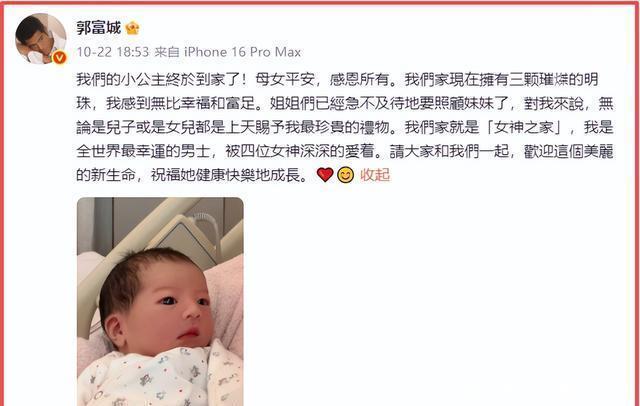 上野 编辑| 洲洲影视娱评 2025年10月22日,郭富城在社交平台分享三胎得女的喜讯,字里行间难掩喜悦。 然而评论区却被“巨额家产没儿子继承”“坐实岳父命”等嘲讽声占据。