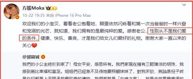 03一句话堵住悠悠之口 方媛转发郭富城官宣的动态,并附文: “性别从来不是我们的爱的条件”。 短短十二个字,既直接回应了网友关于重男轻女的质疑,又明确传达出夫妻俩对待孩子性别的价值观。 在他们眼中,孩子的性别无关紧要,爱与陪伴才是核心。 这番恰到时机的发声,如同给沸腾的舆论浇了一盆冷水,让持续发酵的争议瞬间降温。
